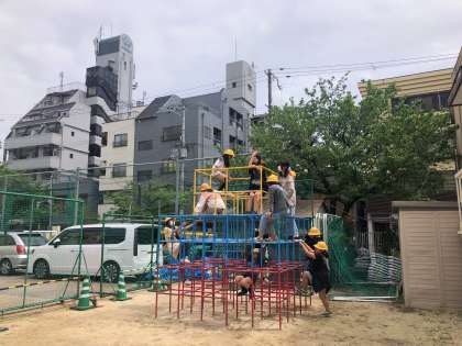 子どもたちは大喜びで遊んでいます。また、今日から、工事関係のために使用できなかったジャングルジムも再開しています。