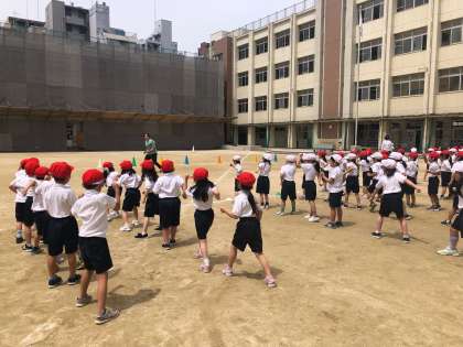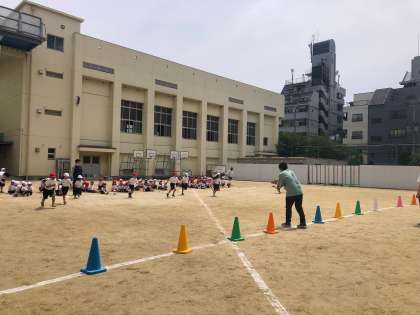 「走る」学習です。腕をしっかりと振ることで走るパワーを出そう!と子どもたちに伝えました。子どもたちは、しっかりと腕を振る練習をしています。