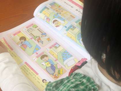 1年の道徳は、「ふたりのゆうた」という題材から学んでいます。生活の様子を2つの頁から違いを見つけます。そこから、正しい生活の様子を考えています。子どもたち自身から、正しい生活習慣に気付くようにしました。