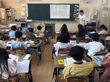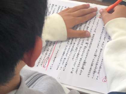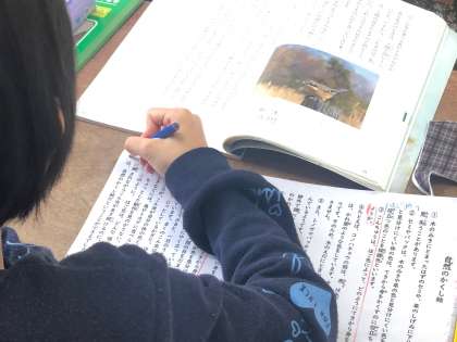 今日は、「たとえば」のように、文と文をつなぐ言葉に着目しました。国語の学習では、全文シート(本文を1枚の用紙にしたもの)を使って学習しています。