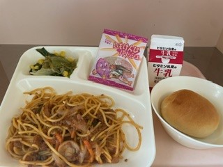 5月7日(火)、今日の給食は「ミートソーススパゲッティ・レタスとコーンのサラダ・いもけんぴフィッシュ・ミニコッペパン・牛乳」です。