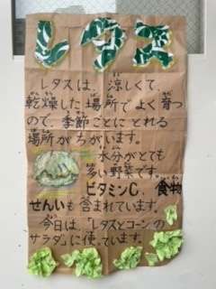 5月は、食材を通して季節感を感じることができるよう、旬の野菜(グリーンアスパラガス、えんどう豆、レタス、トマト、三度豆、たけのこなど)を豊富に使っています。今日は、旬のレタスを使った「レタスとコーンのサラダ」です。給食ではレタスを生食できないので、オーブンで蒸してから調理しています。