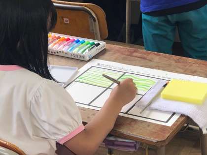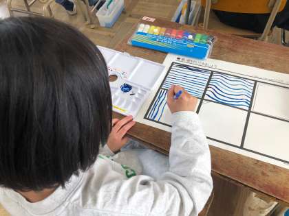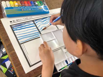 2年生から絵の具を使います。今日は、直線や波線、うずまき等、絵の具の使い方を学びました。