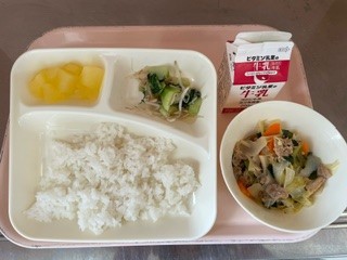 5月8日(水)、今日の給食は「中華煮・チンゲンサイともやしのしょうがあえ・りんご(カット缶)・ごはん・牛乳」です。