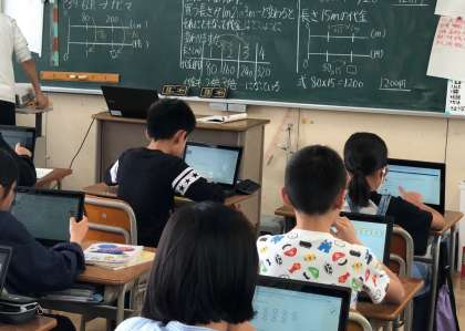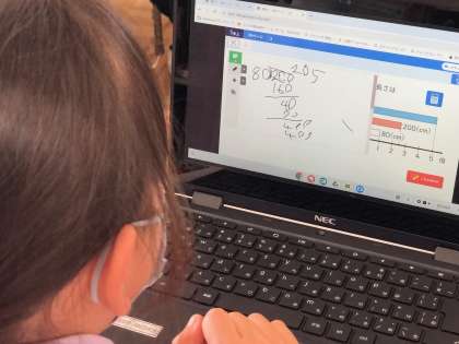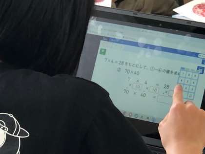 図や表、数直線を使って比例の問題に取り組み、理解を深めています。端末を使って、練習問題にも取り組んでいます。