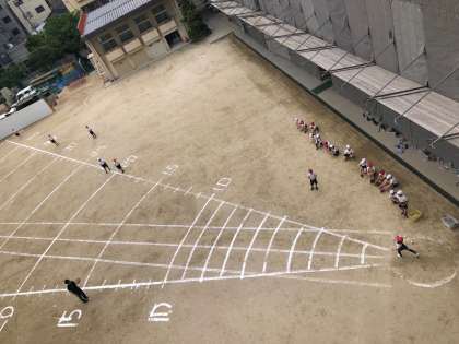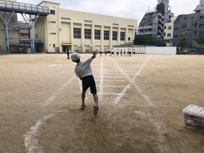 4年の体育。今週はスポーツテストです。今日は、ソフトボール投げをしました。