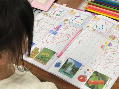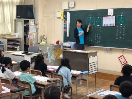 今日は、「ふ」を習いました。1年生では、まず字の形を丁寧に学びます。そして、「ふ」を使ったことばを発表したり、筆順を覚えたりします。子どもたちは、字形を整え、ていねいに書いています。