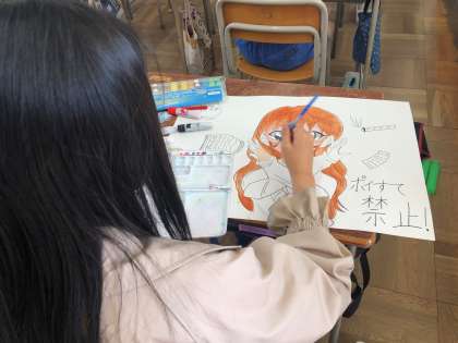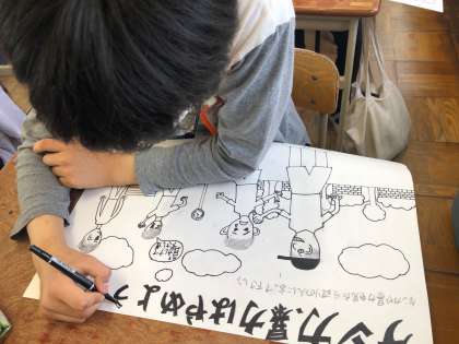 自分たちが思うキャッチフレーズを考え、絵を描いています。