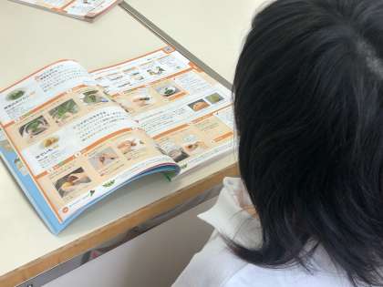 包丁の扱い方、運び方等、実習までにしっかりと学び見通しを持てるようにします。青菜をゆでる当日の実習が楽しみです。
