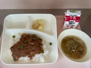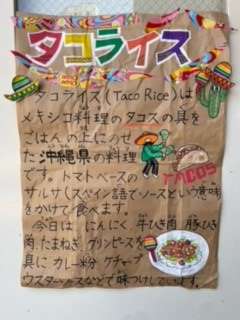 5月17日(金)、今日の給食は「タコライス・もずくのスープ・焼きじゃが・牛乳」です。