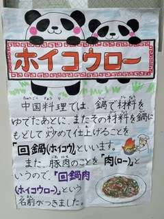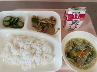5月20日(月)、今日の給食は「ホイコウロー・中華煮・きゅうりのピリ辛あえ・ごはん・牛乳」です。