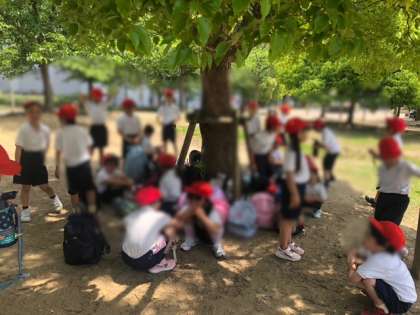 蒸し暑いくらいの天気だったので、遊びの合間に休憩と水分補給タイムを取りました。