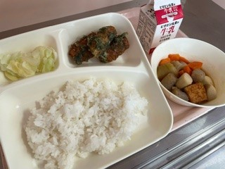 5月24日(金)、今日の給食は「ちくわのいそべあげ・あつあげとさといものみそ煮・あっさりキャベツ・ごはん・牛乳」です。