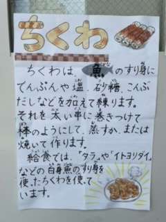 海苔を衣に使った揚げ物を「いそべあげ(磯辺揚げ)」といいます。今日の「ちくわのいそべあげ」は衣に「卵」を使っていないので、卵アレルギーの児童も食べることができます。