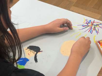 2年の図工は、「たのしかったことやドキドキわくわくしたことをパスで表そう」という題材です。家でのことや学校でのこと、子どもたちは何を描くかを考えて、画用紙いっぱいにパスを使って描いてしました。