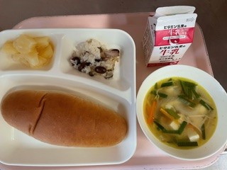 5月28日(火)、今日の給食は「金時豆の中華おこわ・中華スープ・パインアップル(カット缶)・黒糖パン・牛乳」です。