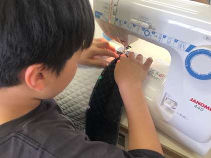 ミシンの使い方を学び、リュックサックを作っています。そのリュックサックを子どもたちは修学旅行へ持っていきます。