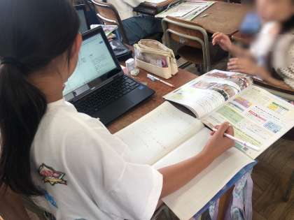 5年の社会は、「沖縄県の観光や文化についてまとめよう」という学習です。温かい地域のくらしの学習で、沖縄県の様子をネット検索をしながら調べました。