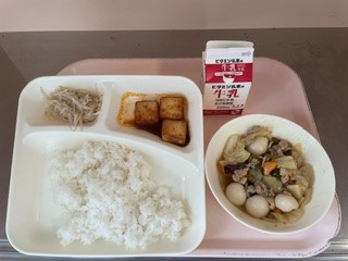 6月5日(水)、今日の給食は「八宝菜・あつあげのピリ辛じょうゆかけ・もやしの中華あえ・ごはん・牛乳」です。