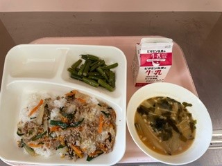 6月7日(金)、今日の給食は「豚ひき肉とにらのそぼろ丼・じゃがいものみそ汁・三度豆のごまあえ・牛乳」です。