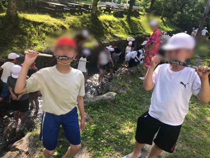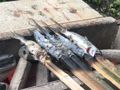 ヤマゴやヤマメの命をいただくことを学びました。 塩をまぶしておいしくいただきました。