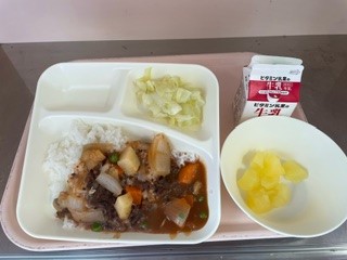 6月14日(金)、今日の給食は「ハヤシライス・キャベツのゆずドレッシング・りんご(カット缶)・牛乳」です。