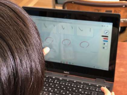 1年の国語では、一人一台端末にインストールされている学習アプリのnabimaに取り組みました。ひらがなの形や筆順等に気を付けて、画面上で練習できます。上手にかけて間違えがないとポイントが貯まります。子どもは、楽しみながら、学べました。