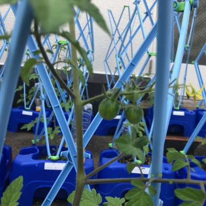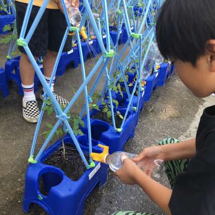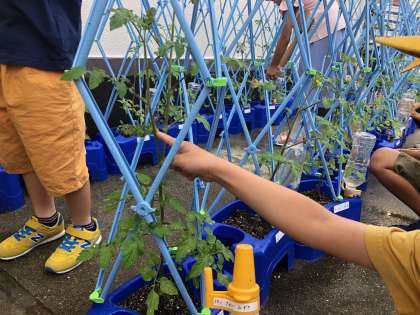 2年が学習園で栽培しているミニトマトが実をつけました。子どもたちは、自分の育てている苗に早く実がなることを祈っていました。