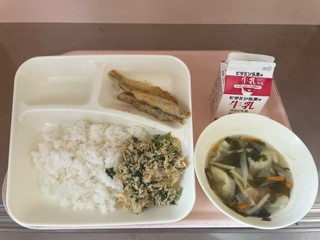 6月21日(金)、今日の給食は「いわしてんぷら・五目汁・とりなっ葉いため・ごはん・牛乳」です。