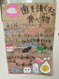 今日は「歯を強くする食べ物」についてふれました。歯をつくるためにカルシウムはたいせつですが、歯の土台となるたんぱく質、カルシウムの吸収を助けるビタミンⅮ(魚、きのこなどに多く含まれます)などもたいせつです。