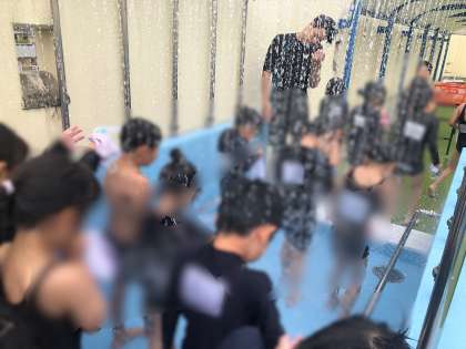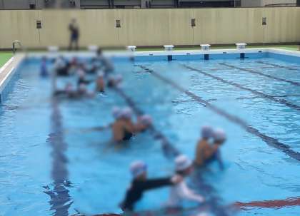 曇り空で少し寒かったですが、きれいな水で水中じゃんけんをしました。いろいろな水遊びをしながら、大きなプールでの水遊びを楽しんでいます。