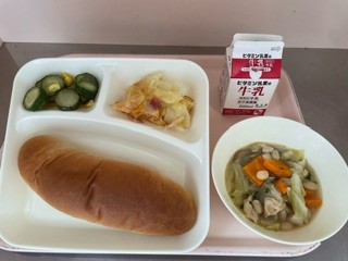 7月4日(木)、今日の給食は「鶏肉とてぼ豆のスープ煮・ベーコンとじゃがいものチーズ焼き・きゅうりとコーンのサラダ・黒糖パン・牛乳」です。