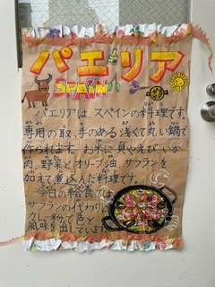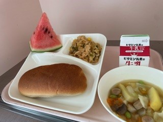 7月9日(火)、今日の給食は「チキンパエリア・ウインナーとキャベツのスープ・すいか・黒糖パン・牛乳」です。