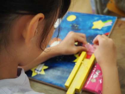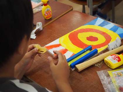 今までの学習で土台の板に絵を描いています。今日から、その上面にくぎを打っていきます。