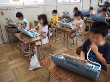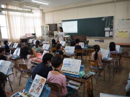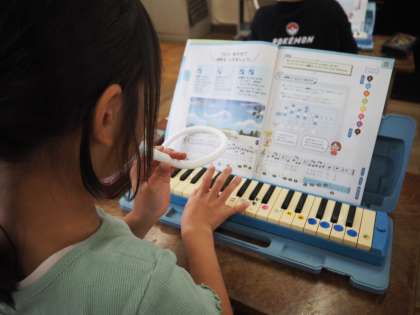 2年の音楽は、♪ぷっかり くじら♬です。歌に合わせて鍵盤ハーモニカを演奏する学習です。押さえる音を確かめながら、がんばって演奏しています。
