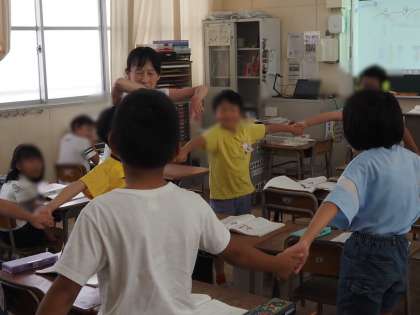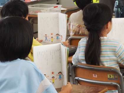 2年生の国語は、詩『そらに ぐうんと 手を のばせ』の学習です。体を動かしながら、声に出して読みました。