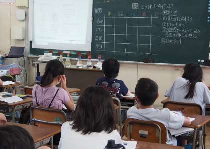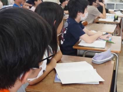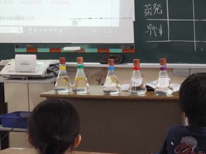実験を前に、先生から諸注意を聞きました。6年生の実験では、(薄い)塩酸等の薬品を使います。取扱い等、細かな部分までしっかりと聞いていました。