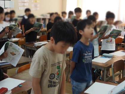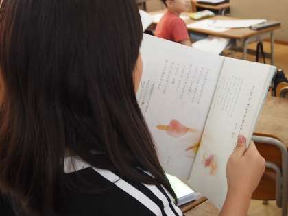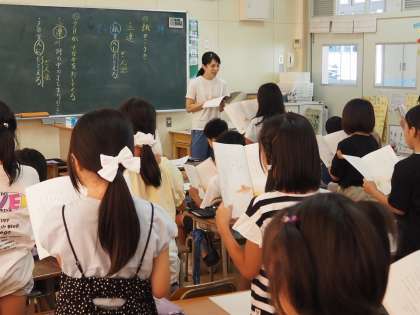 今日は、「紙ひこうき」と「夕日がせなかをおしてくる」の詩を読みました。その中で、擬人法についても学びました。