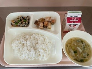 9月3日(火)、今日の給食は「さけのつけ焼き・五目汁・高野どうふのいり煮・ごはん・牛乳」です。