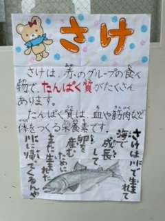 今日の「さけのつけ焼き」は角切りのさけに料理酒と砂糖、こいくちしょうゆで味をつけてからオーブンで焼いています。甘辛いしょうゆ味でごはんがすすみました。