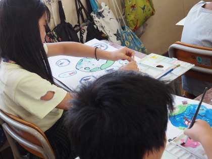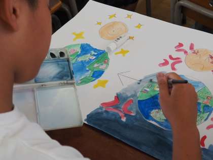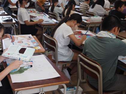 5年の図画工作では、環境に関するポスター図画を制作しています。一人一人自分の関心を応じてメッセージがこめられています。