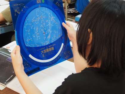子どもたちには、時間が経つと月と同じように星座の位置や並び方は変わるだろうか?という問いを投げかけました。子どもたちは様々な予想をし、そのあと映像資料から確かめました。