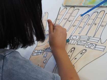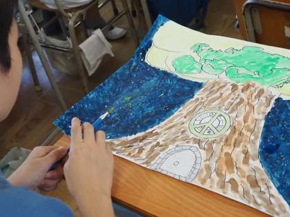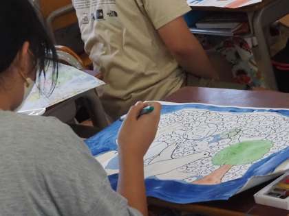 6年では、「港区政100周年絵画作品コンクール」の絵画に取り組んでいます。港区の未来や地球のよりよい未来を想い浮かべながら、作品を仕上げていました。