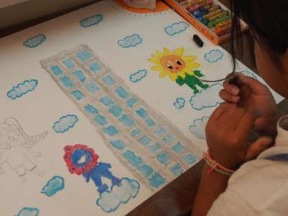 3年では、「港区政100周年絵画作品コンクール」の絵画に取り組んでいます。港区の未来や自分たちの未来のことも考えながら、作品を仕上げていました。万博のマスコットキャラのミャクミャクを描く子もいました。