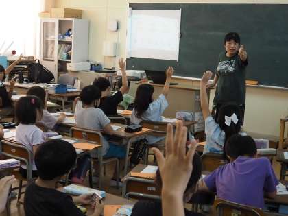 3年の英語活動では、何が好きなのか(I like 〜. He like 〜.)について、会話を聴き取り、絵を見て答えました。子どもたちの聴く力も育っています。