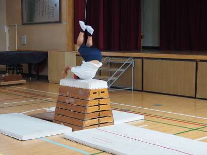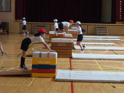 台上前転、開脚跳び、かかえこみ跳び等いろいろな跳び方に挑戦しました。