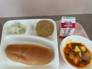 9月24日(火)、今日の給食は「チキンレバーカツ・ケチャップ煮・キャベツのバジル風味サラダ・黒糖パン・牛乳」です。