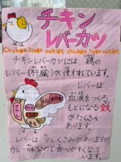 レバーは鉄やビタミンAを豊富に含む食べものです。今日の給食のチキンレバーカツには不足しがちな栄養素である鉄が、1個50g当たり0.7mg含まれています。