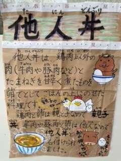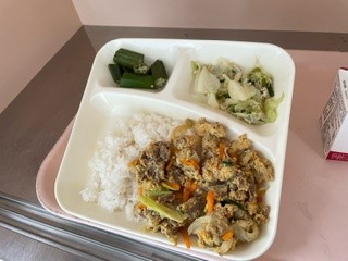 9月25日(水)、今日の給食は「他人丼・ささみと野菜のいためもの・オクラの甘酢あえ・牛乳」です。