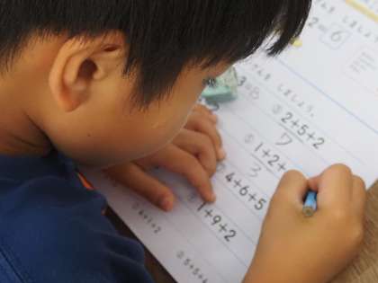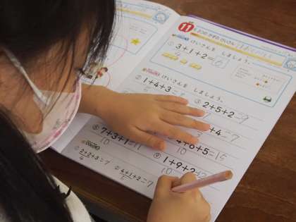 1年の算数は、「3つの数の計算」です。算数ののノートを使って、計算問題を頑張っています。